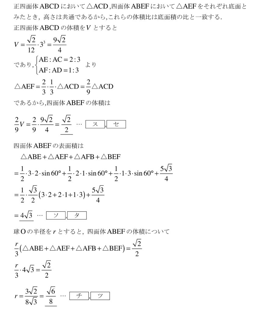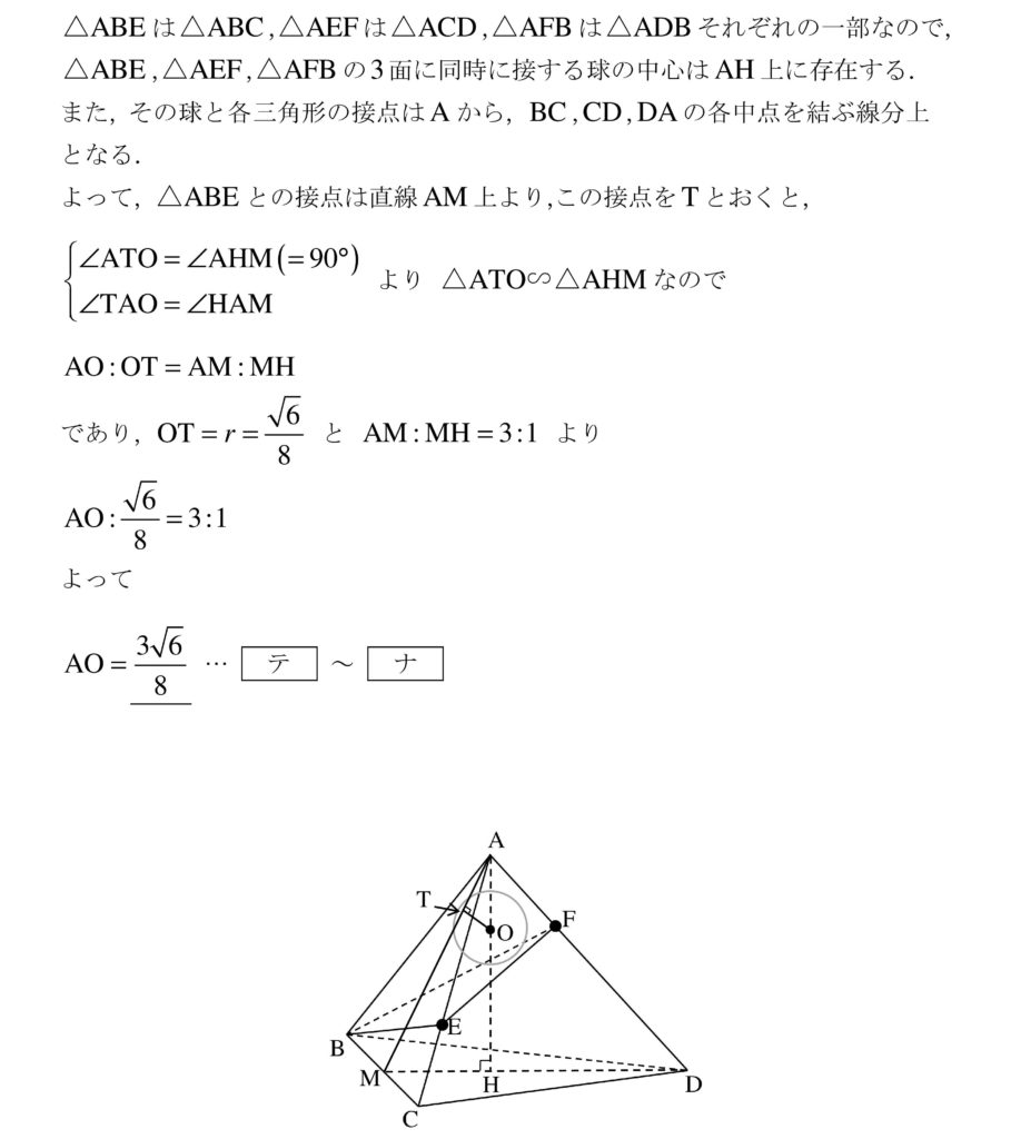 最後のAOの長さ求めるやつ、大学側の誤植としか思えないです。 まず、球と各面との接地点がわからないので、平面に分割する定石が使えません。また、空間ベクトルを使うやり方も塾の先生と考えましたが、結局無理でした。