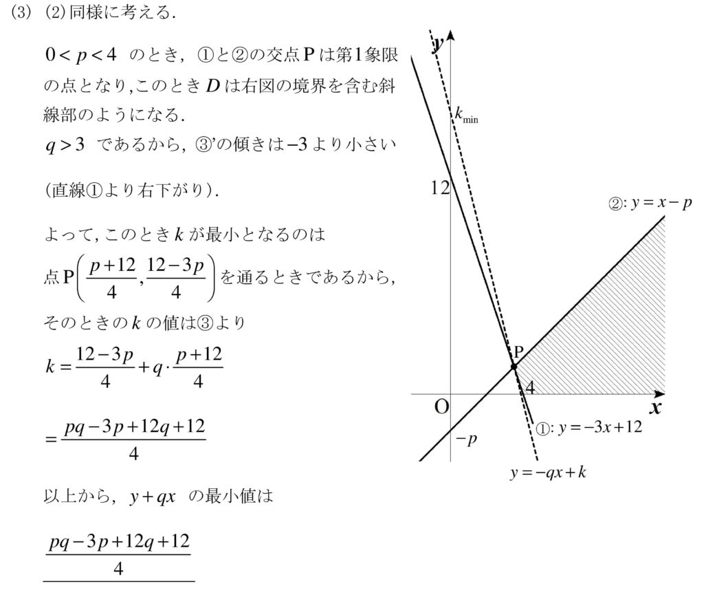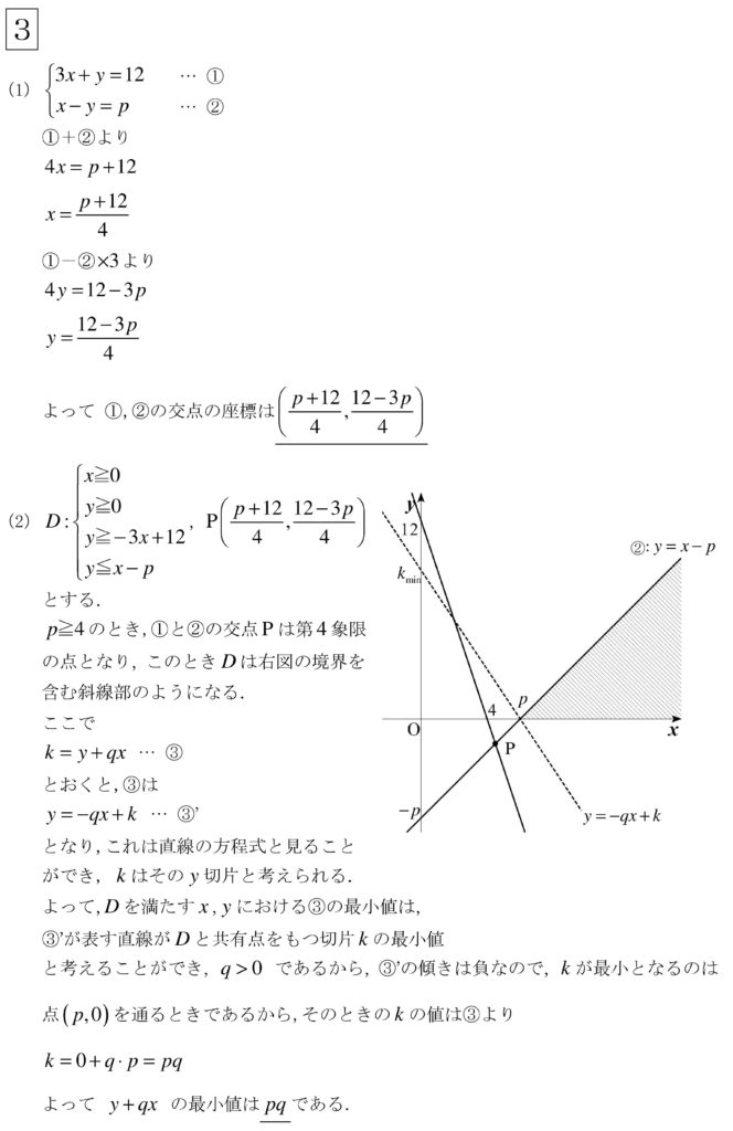 苦手な人はとことん苦手が線形計画法の問題。(2)までは得点したいところ。(3)は直線y=-3x+12とy=-qx+kの傾きを正確にイメージしないと間違った計算をしてしまうので注意。解答作成時間の半分はグラフ,領域の図示に費やしてしまった…