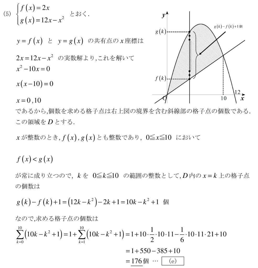 (5)も格子点の問題の中では基礎的な問題ではあるが、g(k)-f(k)で計算してしまわないように。