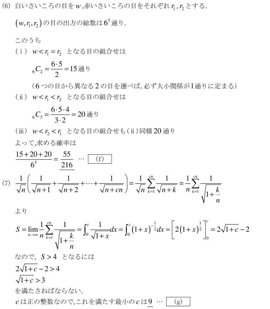 (6)は計算でさっと組合せが求められると良いが、案外遠回りした受験生が多そうな問題。