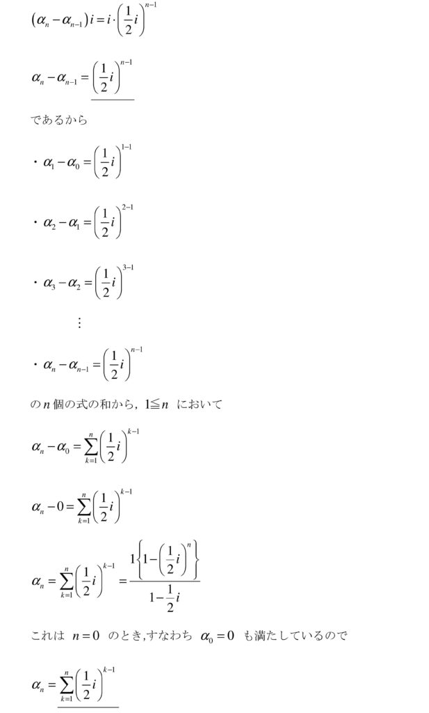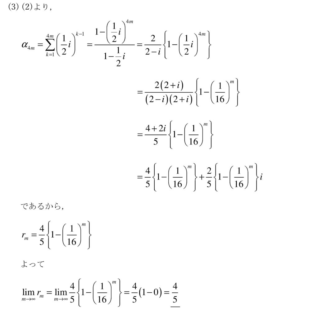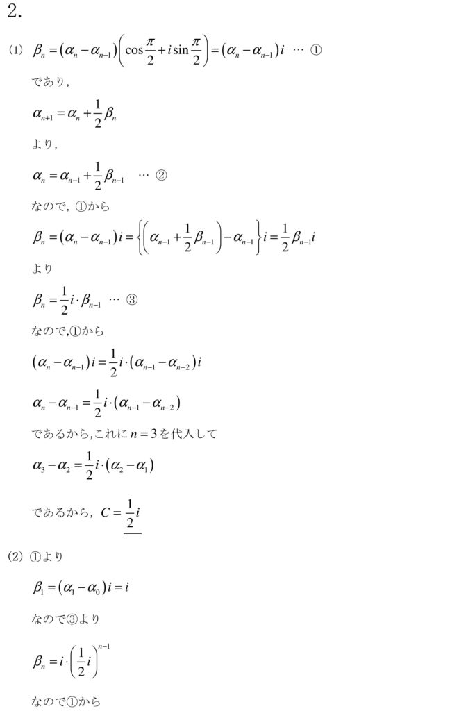複素数を絡めた漸化式の問題。(1)は{βn}の公比を求めているだけということに気付かず、各項の値をガチ計算して時間をとられた受験生も多そう。(2)もただの階差数列だが、第0項が初項のタイプなので書き間違えに注意したい。そのため今回はn個の漸化式を全部書き上げた。また、問題にΣで表せと言われているので、第0項も満たしている確認も一応書いた。(3)は(2)まで解ければ特に難しくない問題。